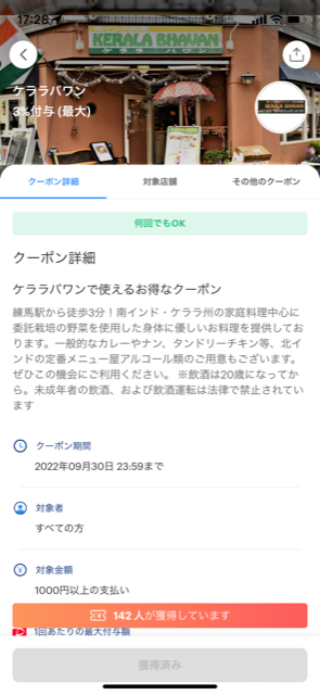 行きつけのカレー屋さんの「ケララバワン」にペイペイのクーポンがあることを教えてもらいました。